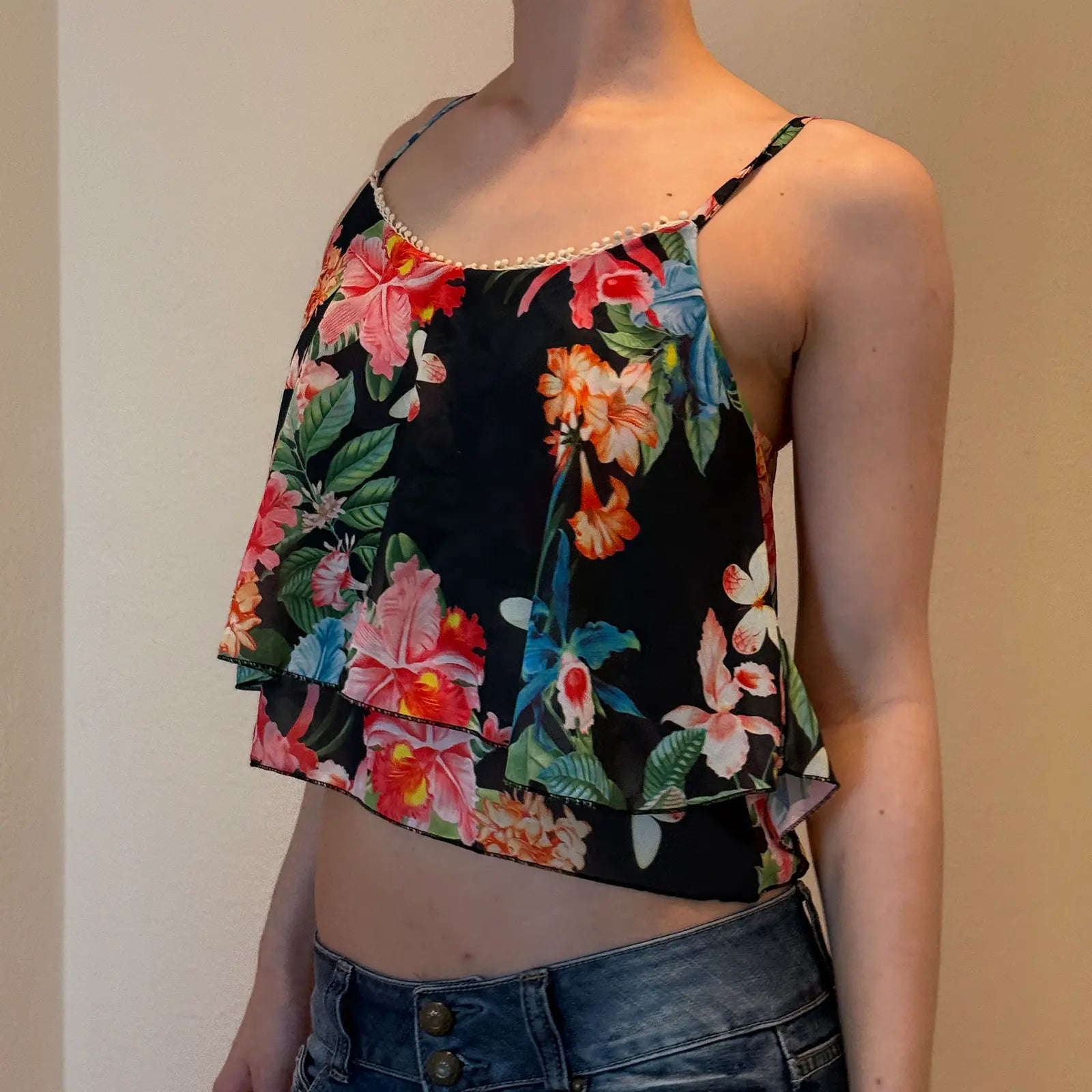 DESCRIPTION: Lightweight and breezy cropped cami with a bold tropical floral print. Features double-layered chiffon-style fabric with a flowy silhouette and delicate pearl trim along the neckline. Ideal for summer festivals, beach nights, or layering over denim.
