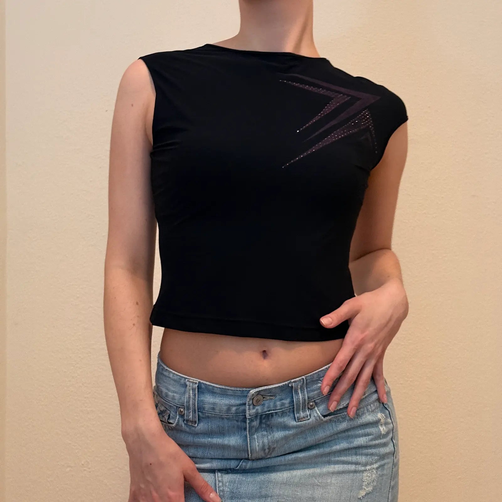 DESCRIPTION: Sporty-chic fitted sleeveless top with rhinestone lightning bolt detail on the chest. Perfect for styling with denim minis, cargo pants, or layering for that true 2000s glam-sporty aesthetic. Stretchy, body-hugging fit with a bold retro vibe.