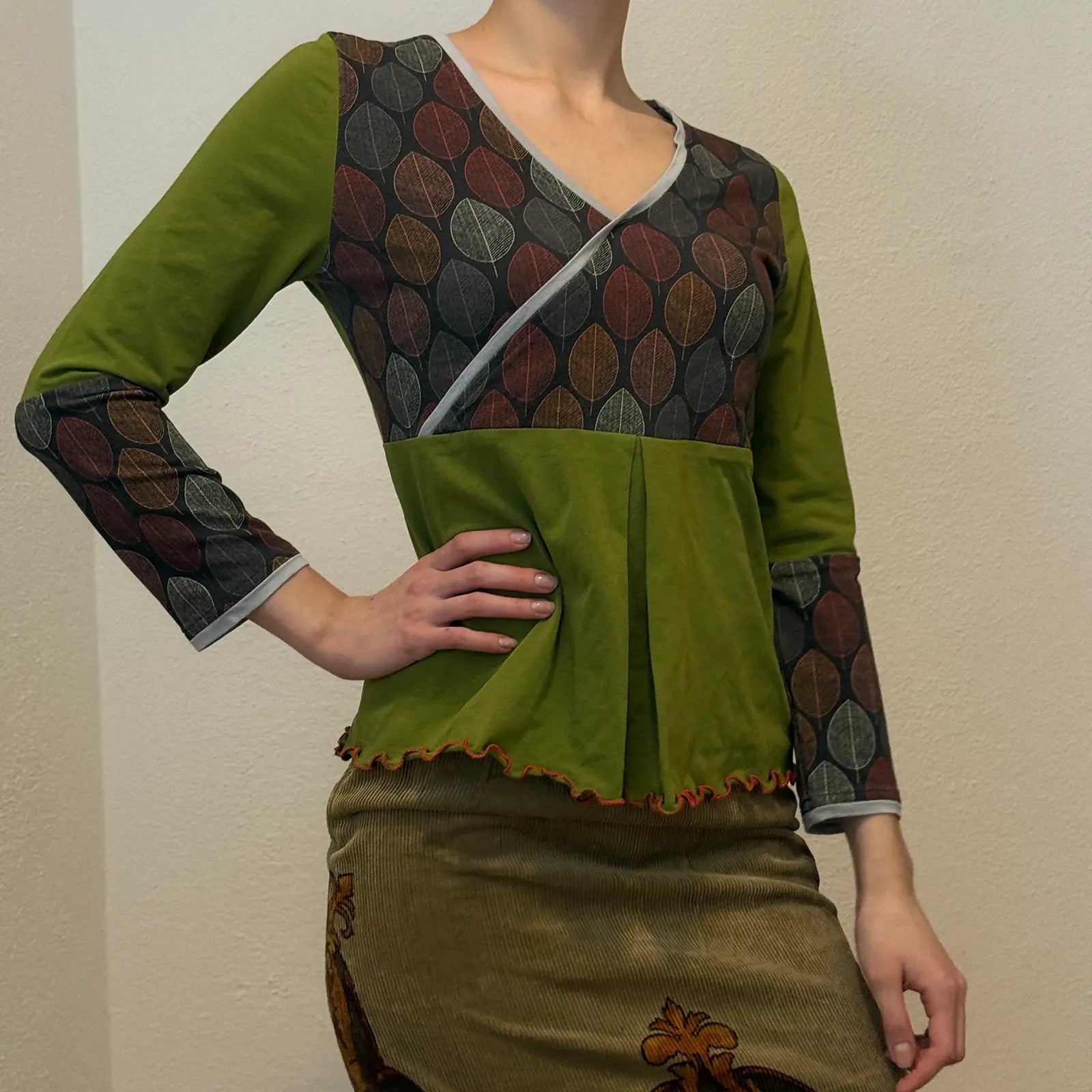 DESCRIPTION: Unique retro boho long sleeve top featuring a deep green base with multicolor leaf print panels and contrast edging. Asymmetrical wrap-style cut with pleated front detail and lettuce hemline. A perfect mix of retro, earthy, and playful vibes.