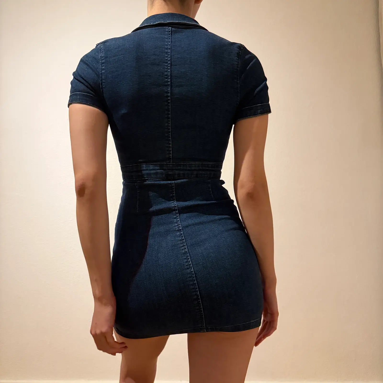 DESCRIPTION: Iconic Y2K denim mini dress featuring a full front zipper, short sleeves, and a structured bodycon cut. Fitted at the waist with functional front pockets and a collared neckline — the perfect mix of sexy and casual. Easy to dress up with heels or down with sneakers and a jacket.