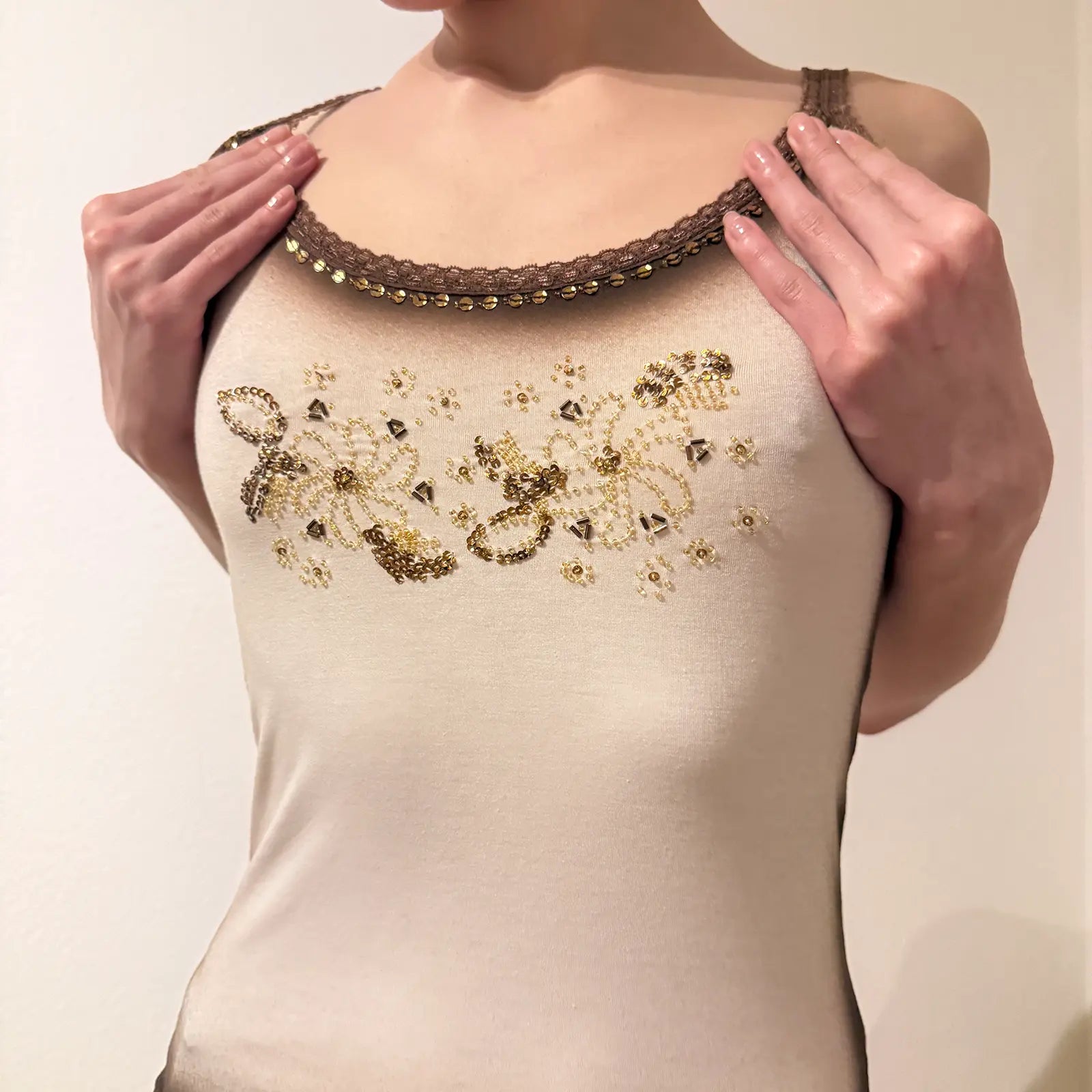 DESCRIPTION: Elegant champagne-gold cami top with intricate gold and bronze sequin embroidery across the chest. Features brown lace trim on the neckline and straps for that soft glam Y2K aesthetic. The shimmery finish gives it a luxe, night-out vibe — perfect with a mini skirt, low-rise jeans, or a faux fur jacket for a full 2000s look.
