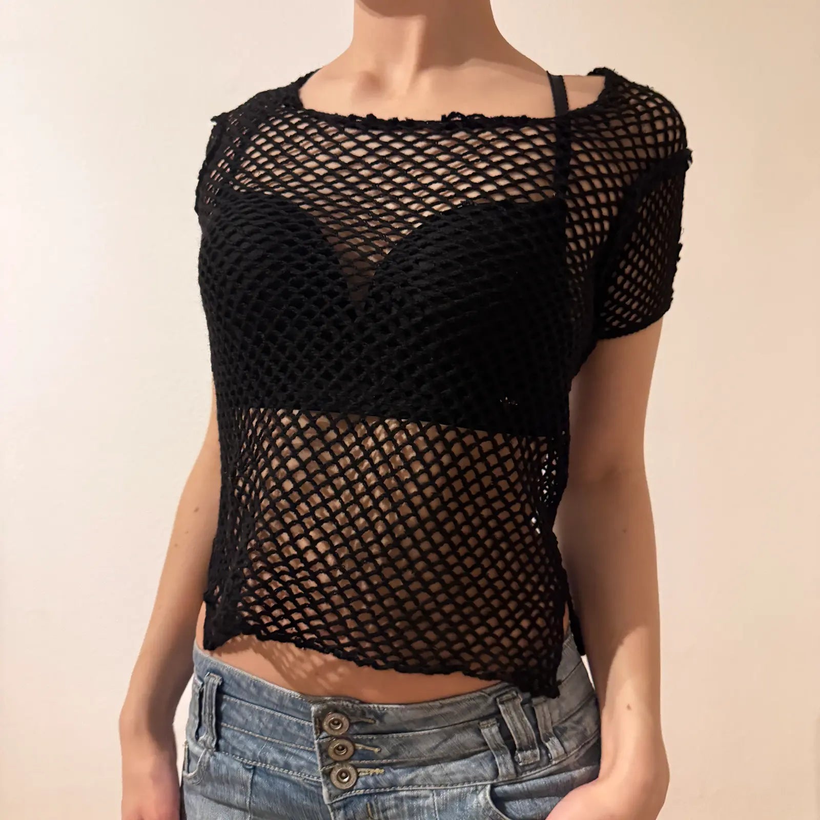 DESCRIPTION: Short sleeve fishnet mesh top. Cropped fit with raw edges and see-through design, perfect for layering over bralettes, tanks, or bikinis. Iconic early 2000s grunge and rave style piece that works for festivals, club looks, or edgy streetwear fits.