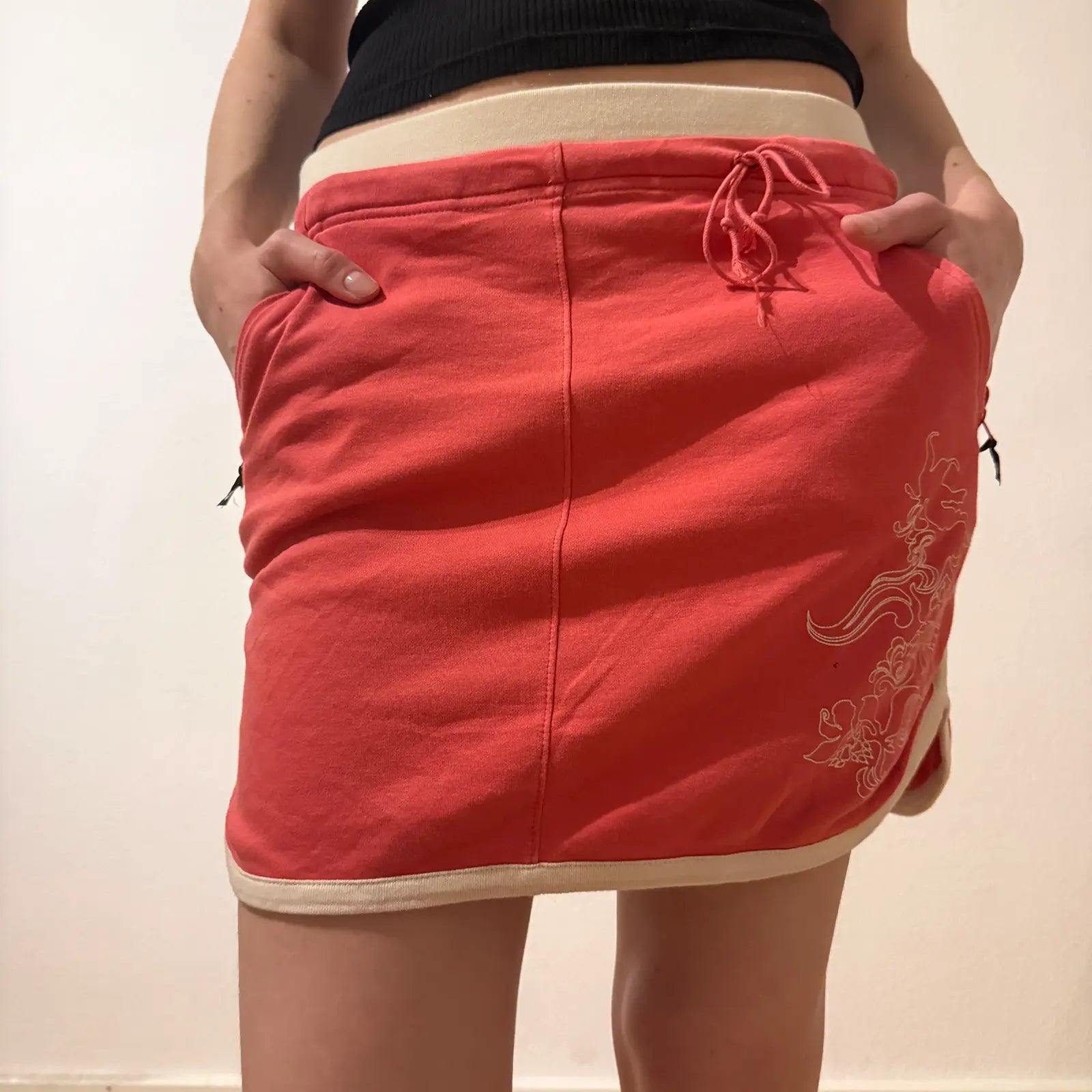 DESCRIPTION: Authentic Jack Wolfskin sporty mini skirt in bold red with embroidered side detailing and contrast hem trim. Designed with a drawstring waist and practical side pockets, it blends comfort with Y2K streetwear flair. Perfect for casual days, activewear-inspired outfits, or adding a retro edge to your look.