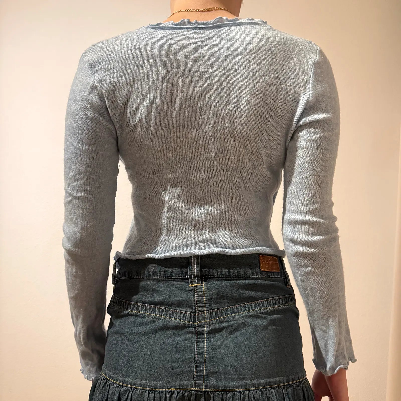 DESCRIPTION: Pure Y2K dreamy energy. This fitted, long-sleeve knit top comes in a delicate light periwinkle shade. It features a flattering crossover (surplice) V-neck and cute lettuce trimming on the sleeves and neckline - a true early 2000s detail.