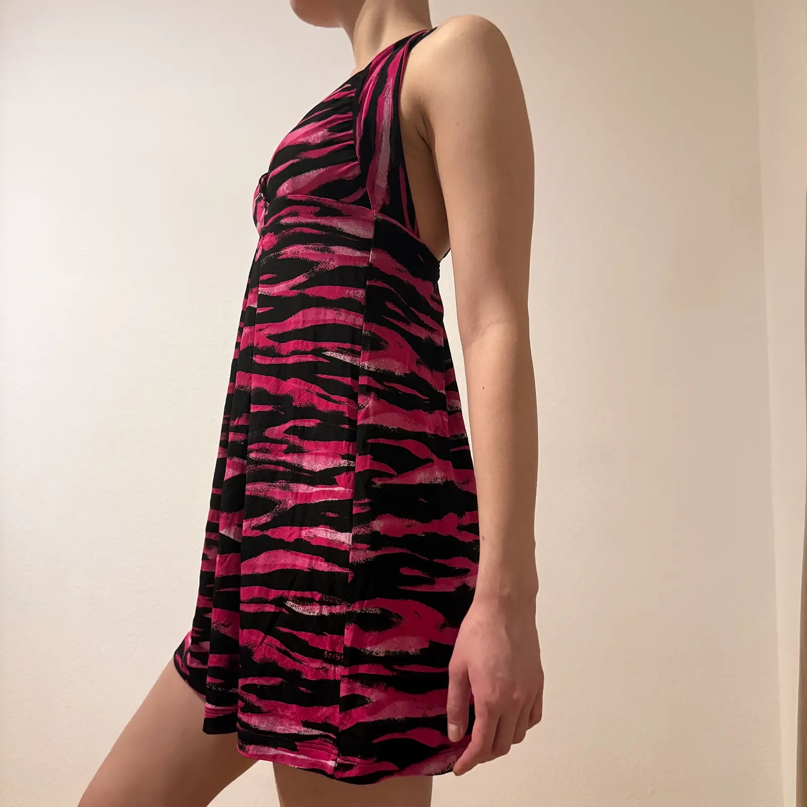 DESCRIPTION: Iconic Miss Sixty mini dress in bold pink and black tiger print. Features a halter tie neck, open back, and soft, slightly shiny stretch fabric that drapes beautifully. A statement early-2000s piece — perfect for night outs, festivals, or channeling pure Y2K energy with knee-high boots and chunky jewelry.