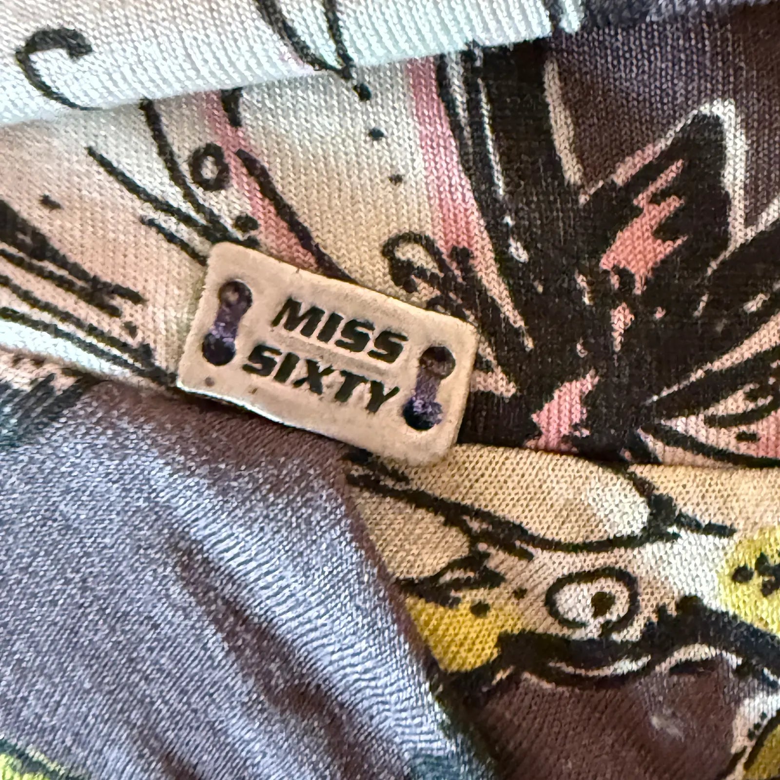 DESCRIPTION: Authentic Y2K Miss Sixty strapless tube top in butterfly floral print with ruched bust detail. Features soft draping and a romantic silhouette, done in earthy olive, lilac, and ivory tones. A rare designer piece from the early 2000s, perfect for collectors and lovers of nostalgic Miss Sixty style.
