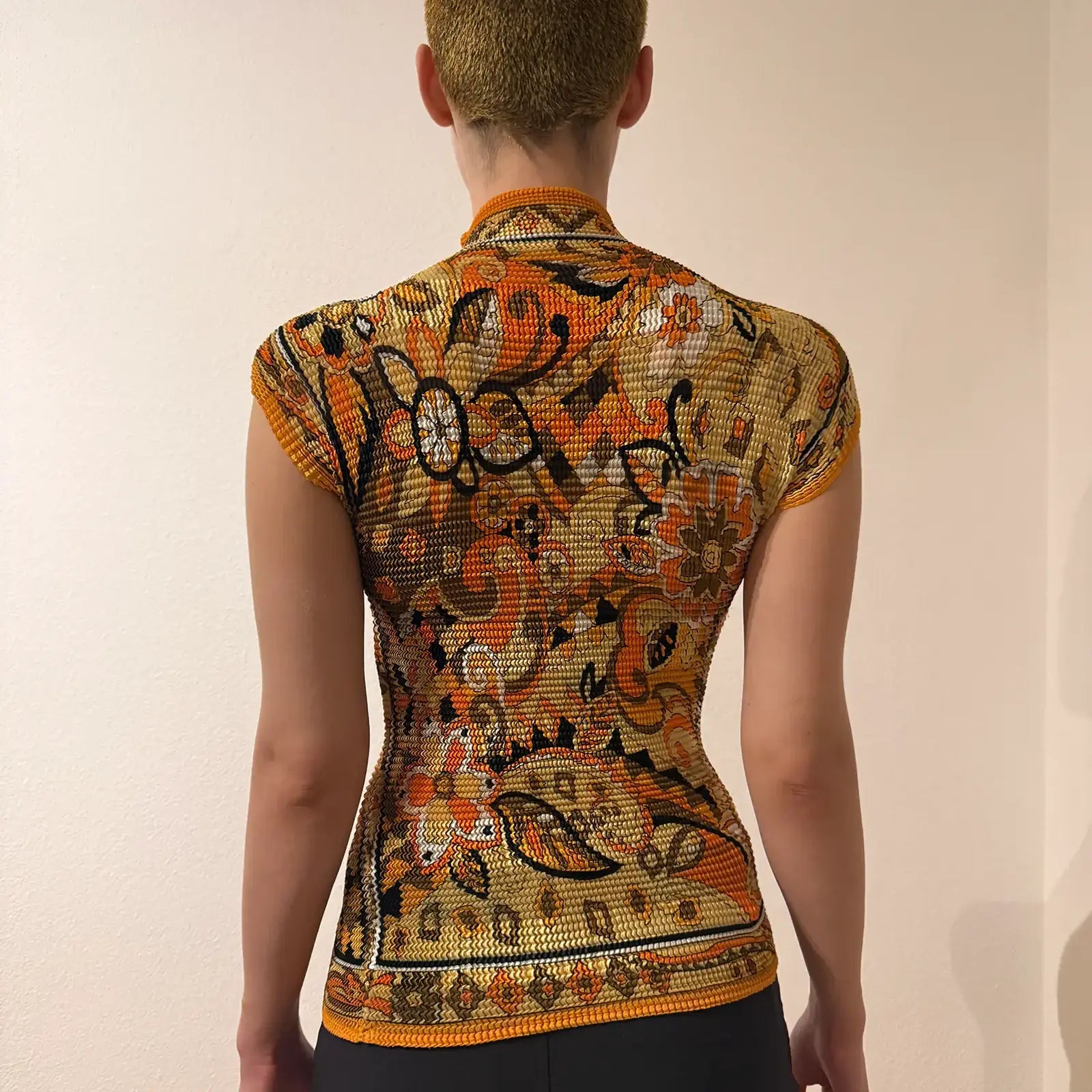 DESCRIPTION: Vintage Y2K sleeveless top with bold multicolor floral and paisley abstract pattern in shades of orange, gold, and black. Semi-sheer with a fitted cut and light shimmer effect that catches the light beautifully.