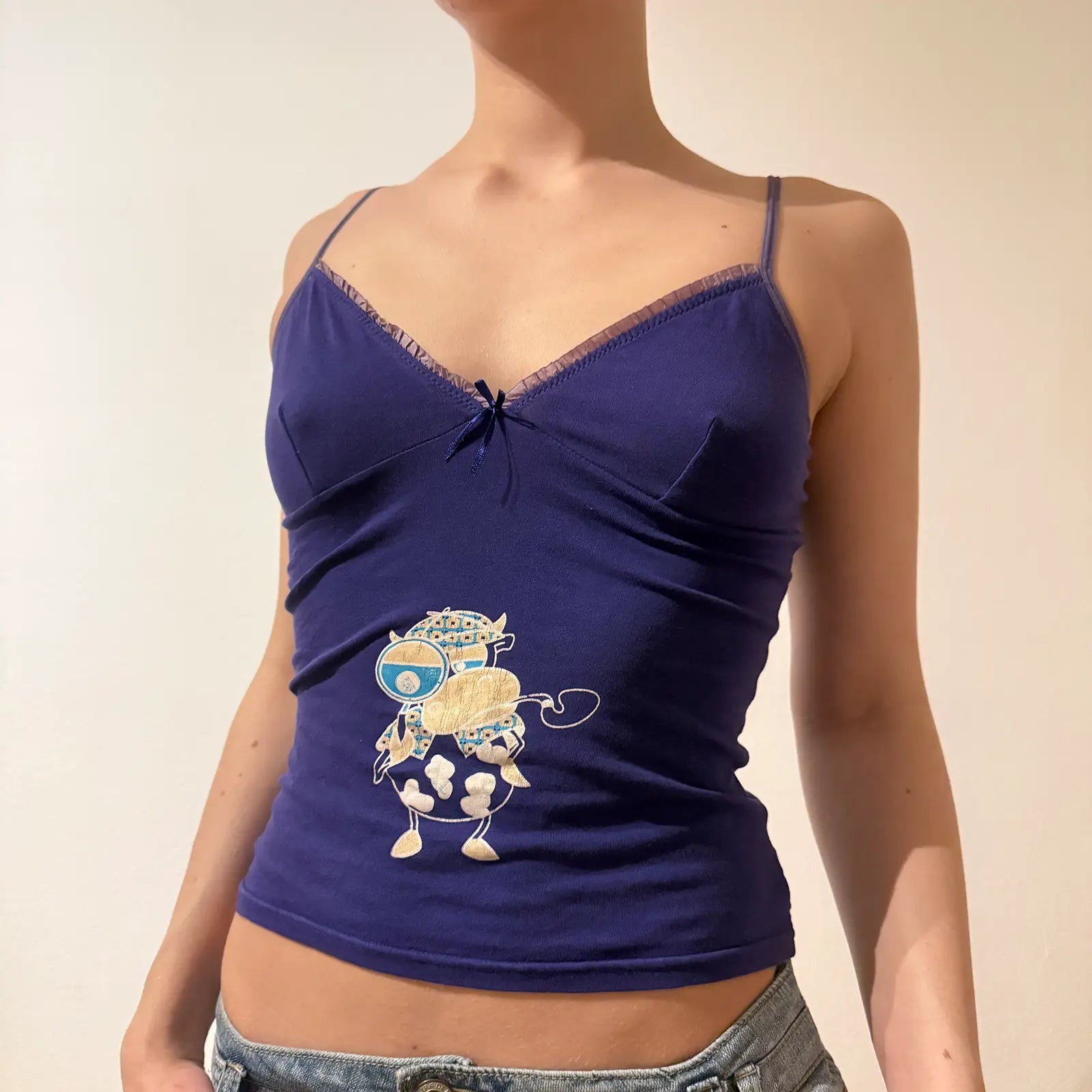 DESCRIPTION: Deep purple cami top featuring a playful cartoon-style cow print and delicate lace trim neckline with bow detail. Soft, body-hugging fit gives a flattering Y2K silhouette. Perfect for pairing with low-rise jeans or a denim mini for a flirty early-2000s look.