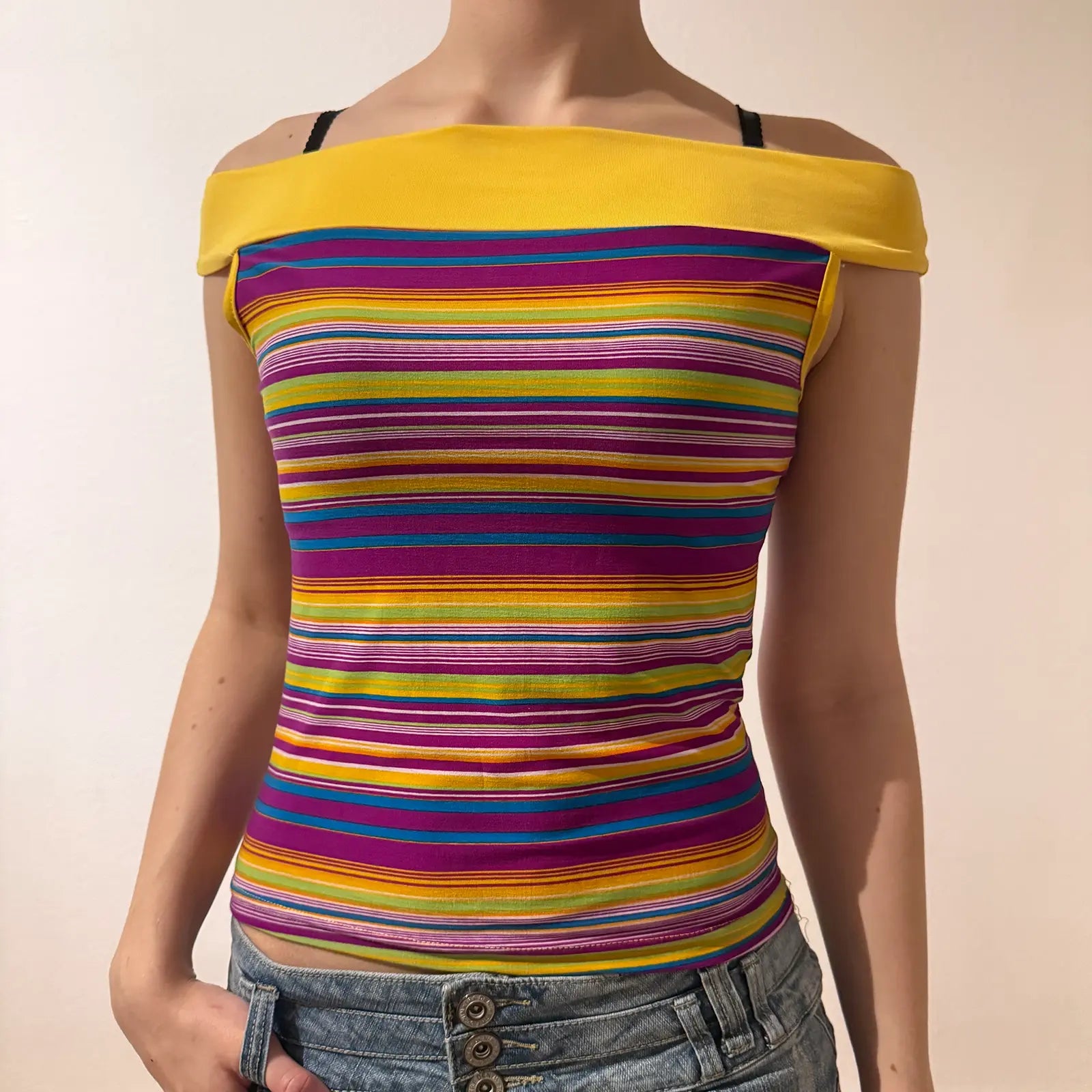 DESCRIPTION: Y2K off-shoulder striped top in bright rainbow colors with bold yellow neckline. Slim fit, stretchy fabric, and playful early 2000s vibe. A statement piece that pairs perfectly with denim skirts, cargos, or layered with a shrug for retro festival and summer looks.