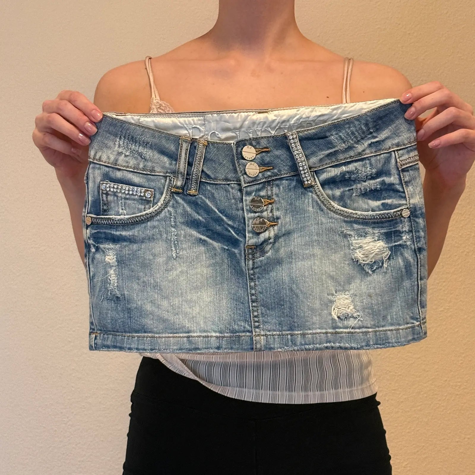 DESCRIPTION: Vintage Y2K denim mini skirt by Rubacuori Luxury. Features a low-rise cut, distressed wash, and rhinestone button accents. Embroidered logo details on the back pocket and silver-tone branded patch at the waist. Made in Italy, size IT 40 (fits XS). Style of early 2000s micro mini with bold clubwear energy.