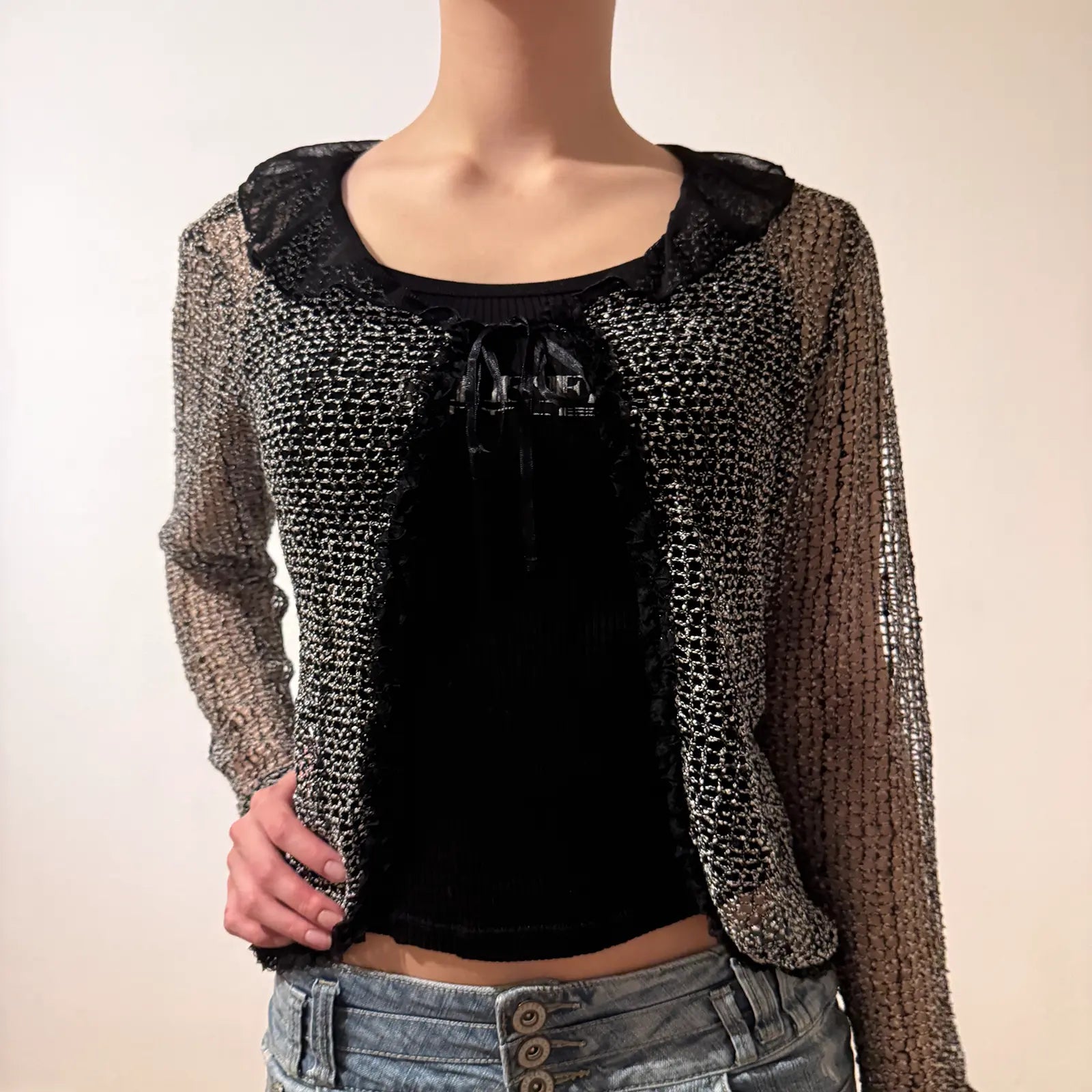 DESCRIPTION: Sheer black mesh shrug-style cardigan with metallic silver thread detailing throughout. Features a delicate lace trim along the neckline and satin ribbon tie at the front. Lightweight and airy, this piece is perfect for layering over camis, dresses, or crop tops for a Y2K party or festival vibe. Adds instant glam to any simple fit.