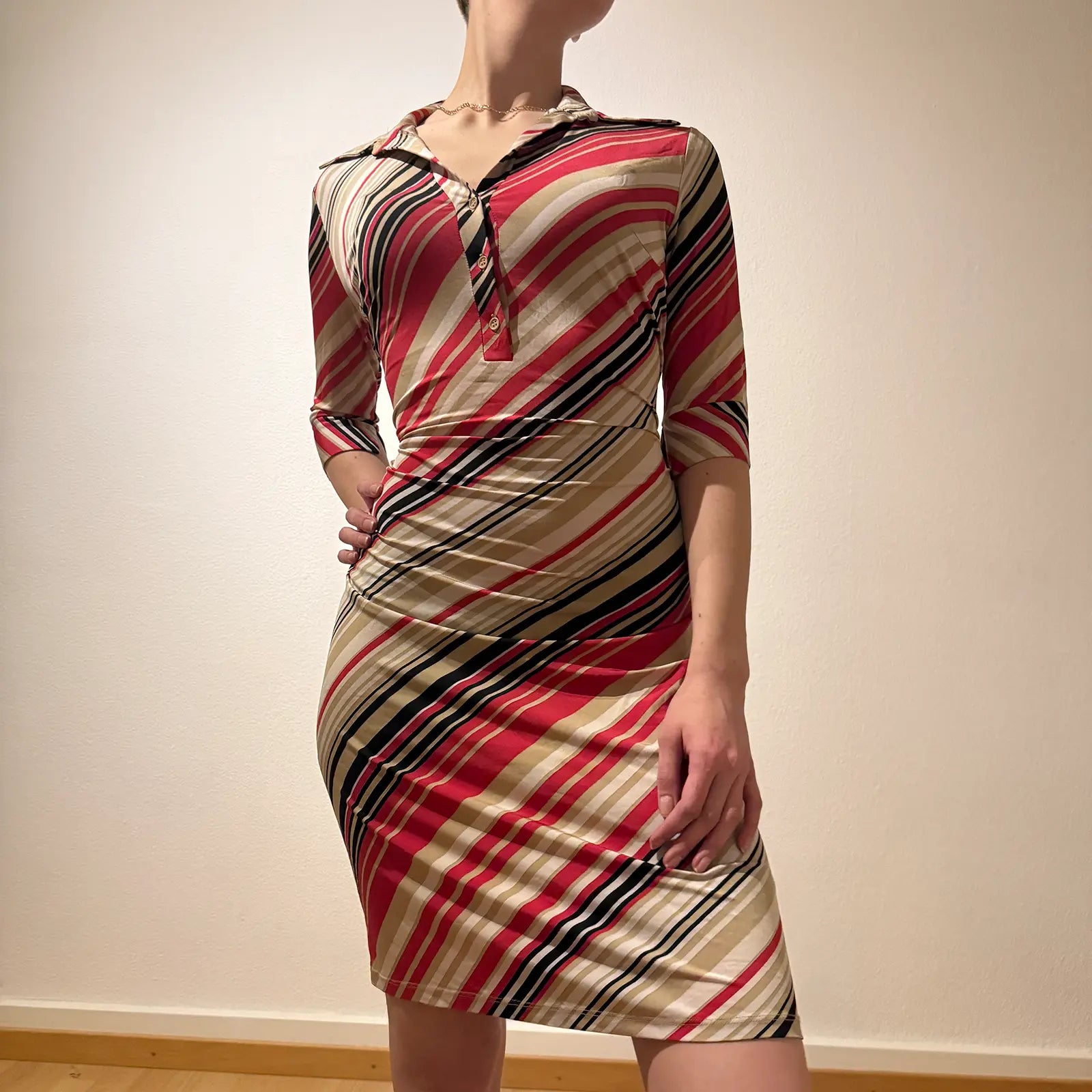 DESCRIPTION: Retro-inspired striped dress in beige, red, and black tones. Features a v-neckline with button detail and a flattering wrap-style effect that highlights the waist. The perfect mix of comfort and style — ideal for everyday wear or a statement vintage look.