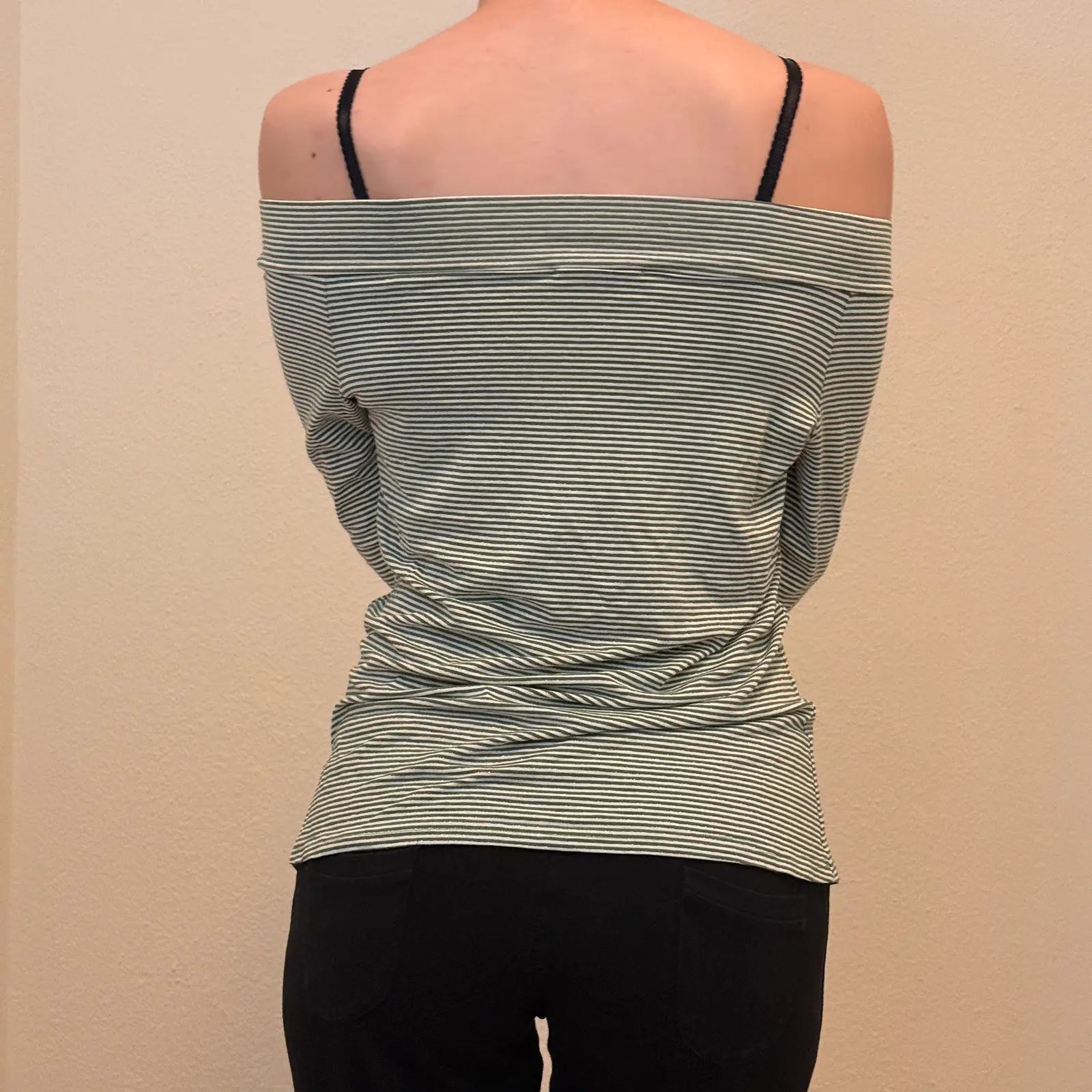 DESCRIPTION: Chic and easy striped off-shoulder top with 3/4 sleeves. Soft stretch fabric gives a relaxed but flattering fit, perfect for layering or wearing on its own. Minimalist style with a subtle Y2K touch, pairs well with denim or skirts.