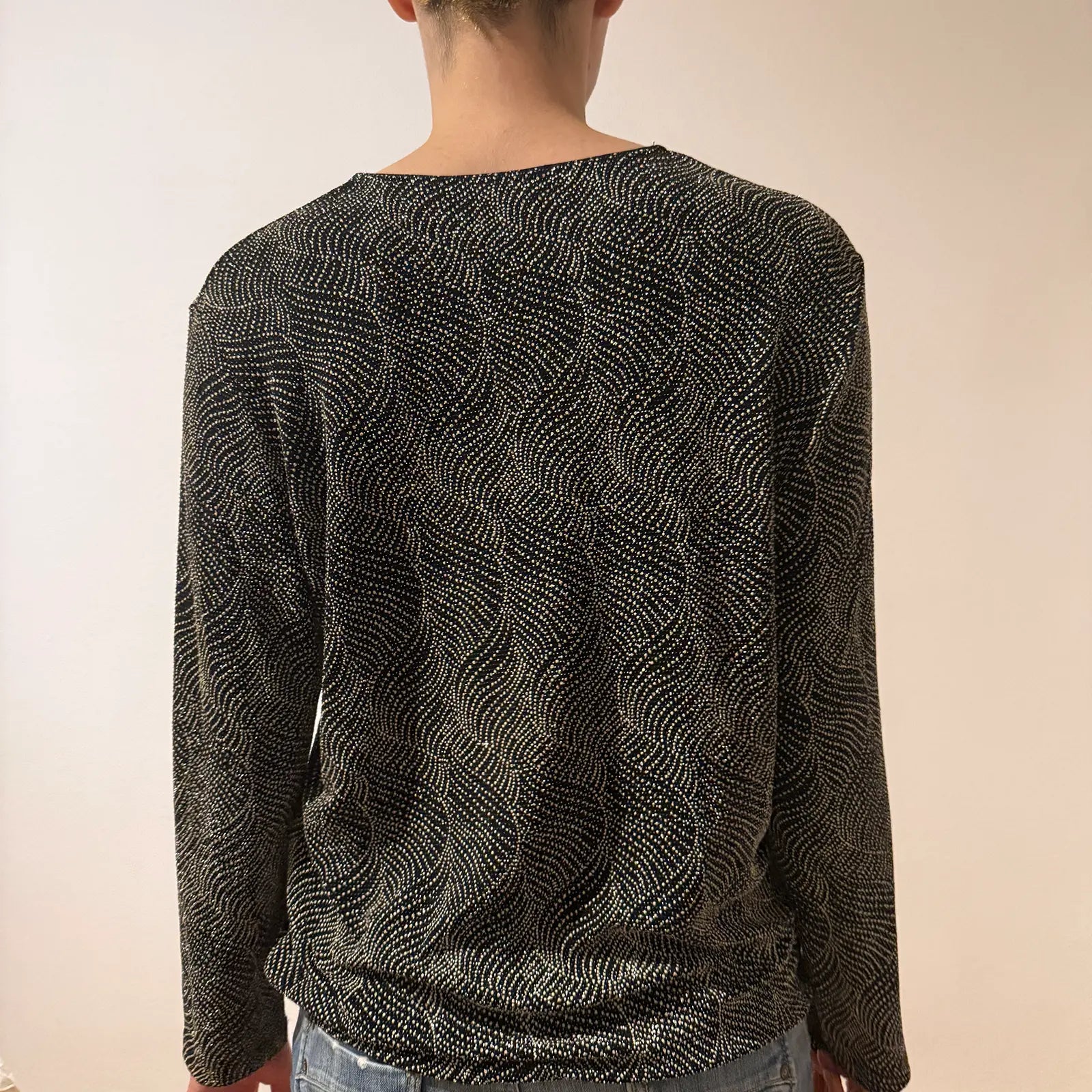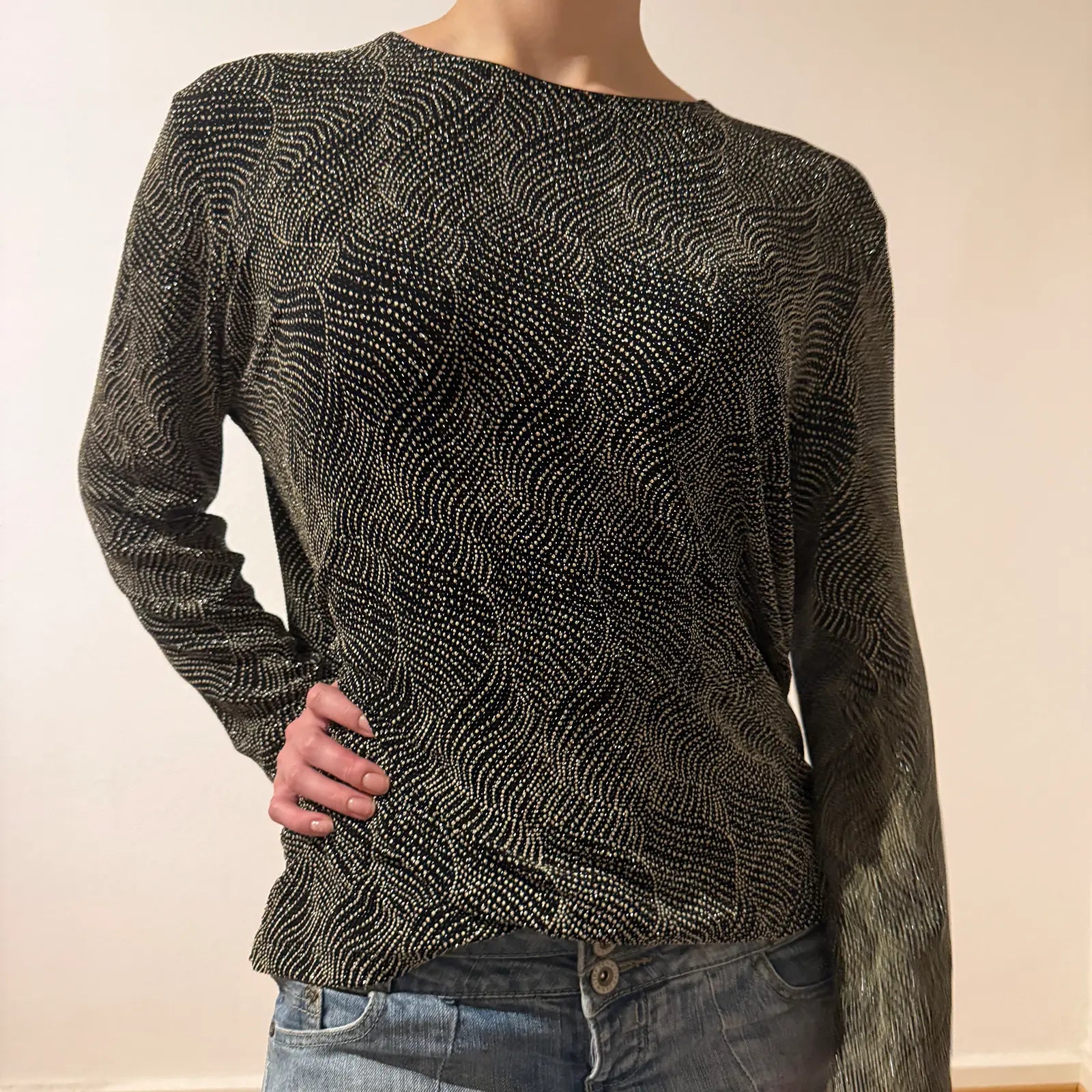 DESCRIPTION: Vintage long-sleeve top with a striking wavy dot pattern that catches the light beautifully. The lightweight semi-sheer fabric makes it breathable yet bold, ideal for layering or wearing on its own. Classic cut with a slightly relaxed fit — a versatile piece that balances minimalism with a touch of sparkle. Perfect for dressing up denim or pairing with skirts for that sleek Y2K night-out vibe.