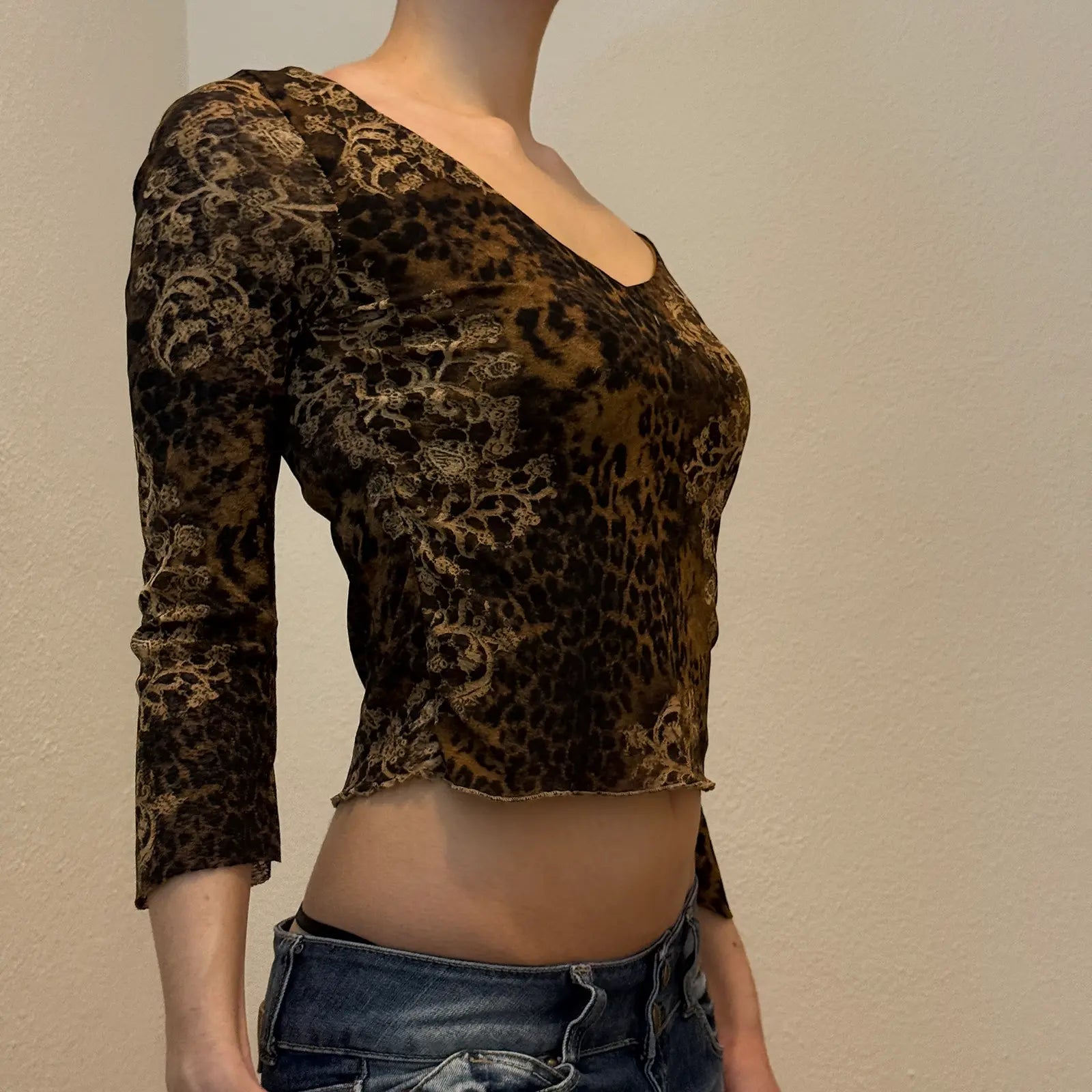 DESCRIPTION: Striking vintage Y2K brown top with leopard print and subtle floral details. Designed with a deep V-neckline and fitted cut, this piece blends sultry animal print with soft stretch for a luxe retro vibe. Perfect styled with low-rise jeans, leather pants, or a mini skirt for a true 2000s look.