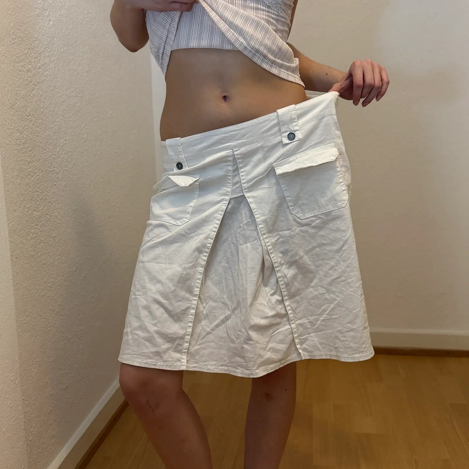 DESCRIPTION: Vintage white utility-style skirt with front pleats and oversized flap pockets. A perfect mix of casual and edgy, giving off those 2000s cargo skirt vibes. Lightweight cotton makes it comfy and versatile for everyday wear.