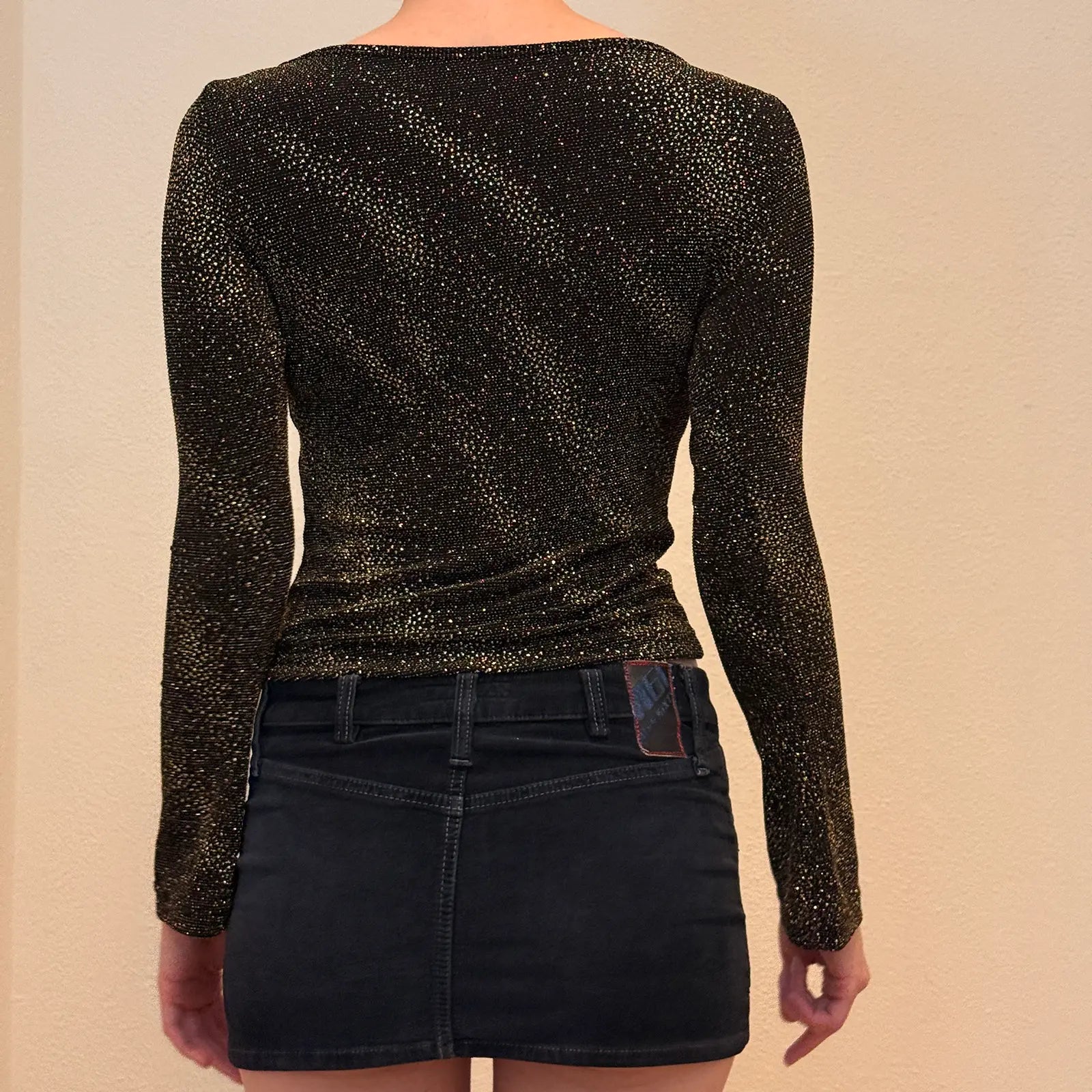 DESCRIPTION: Vintage Y2K long sleeve fitted top in black with all-over gold shimmer. Features a flattering body-hugging fit and subtle flare at the cuffs. Perfect for nights out, holiday parties, or styled with a mini skirt for a true 2000s glam look