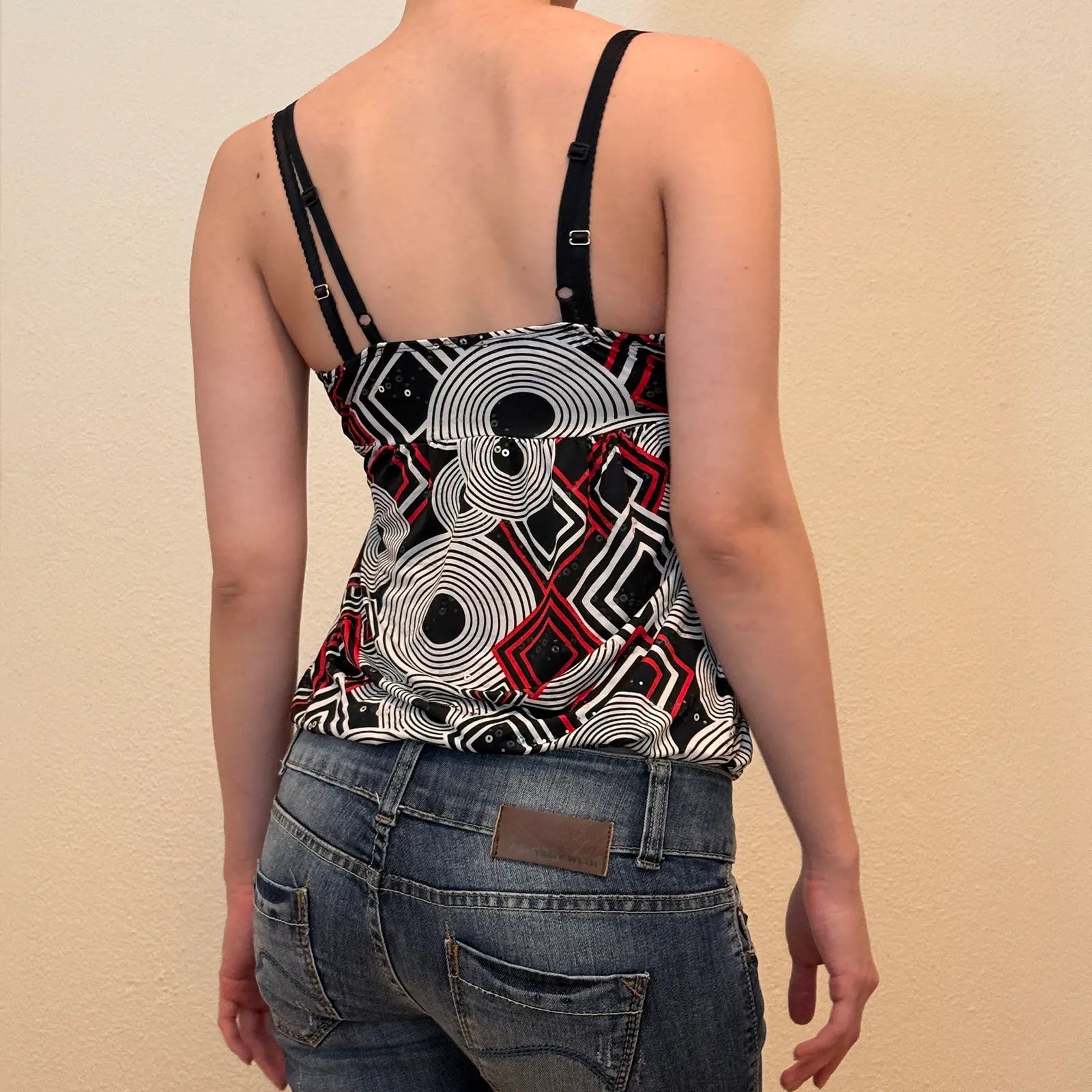 DESCRIPTION: Bold Y2K graphic print cami top in black, white, and red with geometric circle and square patterns. Features a plunging neckline with padded cups, tie-front bow detail, and empire waist fit. A stretchy, comfy statement piece that pairs perfectly with low-rise jeans for that 2000s going-out vibe.
