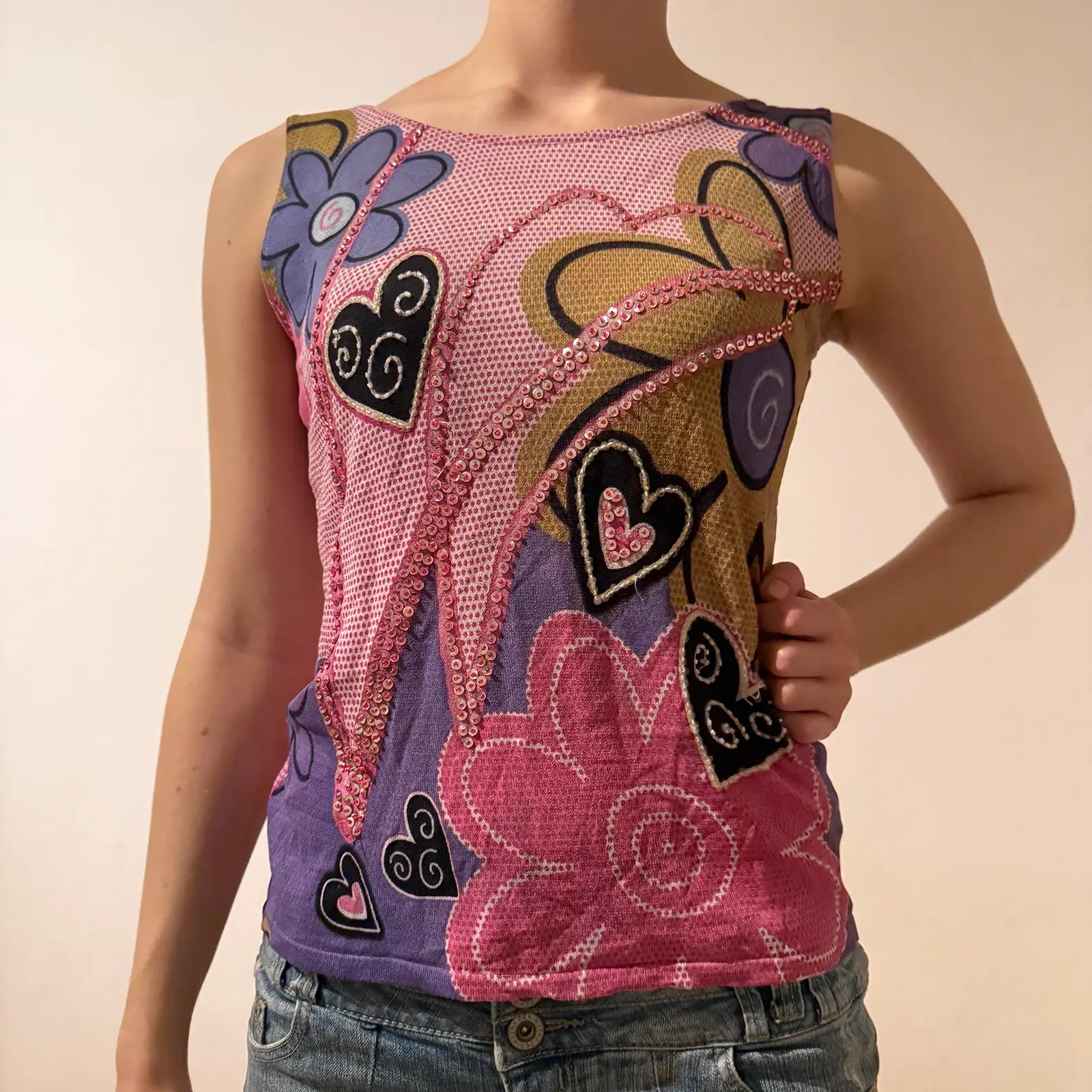 DESCRIPTION: Eye-catching Y2K-style tank top with a vibrant patchwork of hearts, flowers, and swirls in pink, purple, and gold tones. Decorated with sequins and embroidery for extra sparkle and texture. The mesh overlay adds dimension, making it a playful and bold statement piece. Perfect for festival looks, nights out, or adding some retro flair to casual outfits.