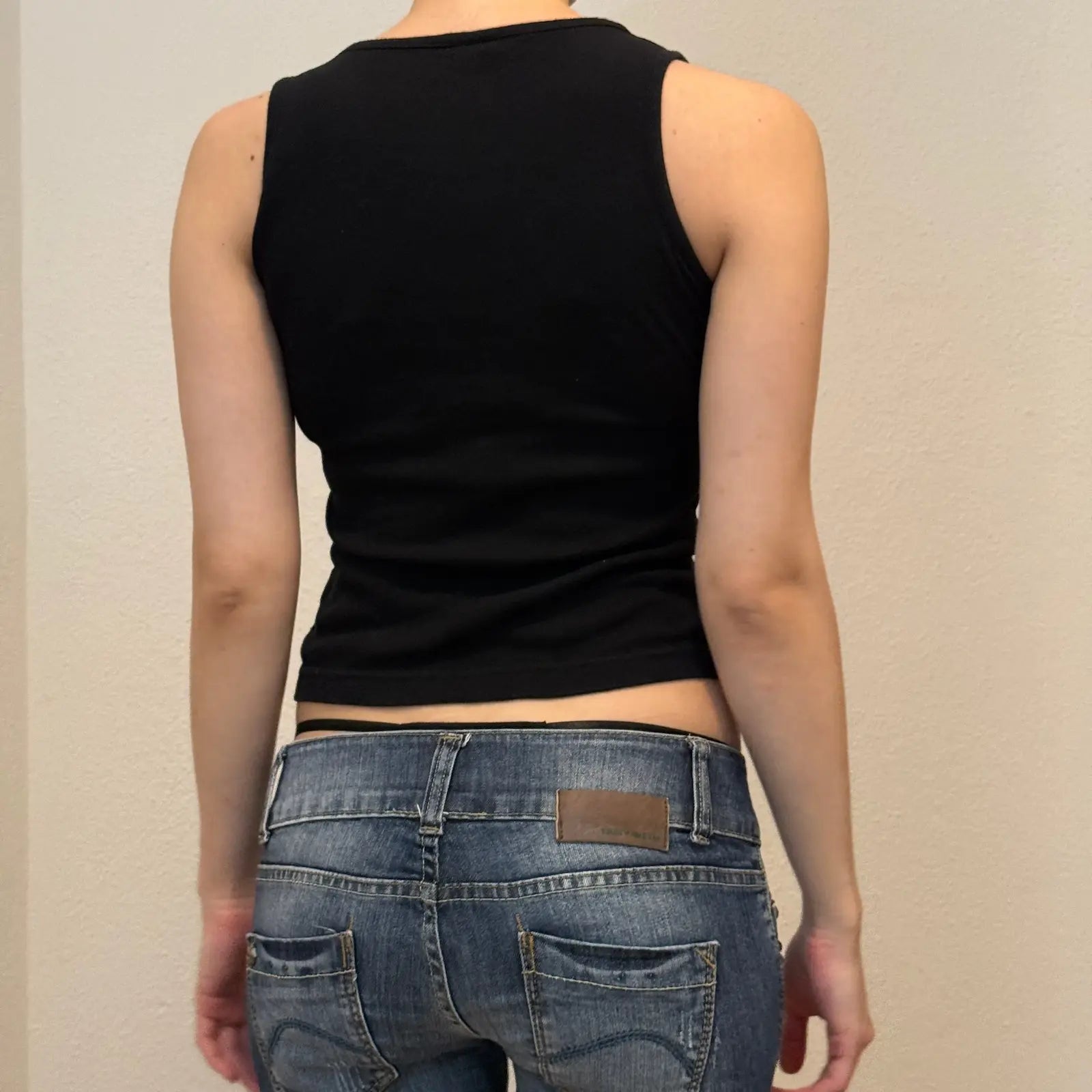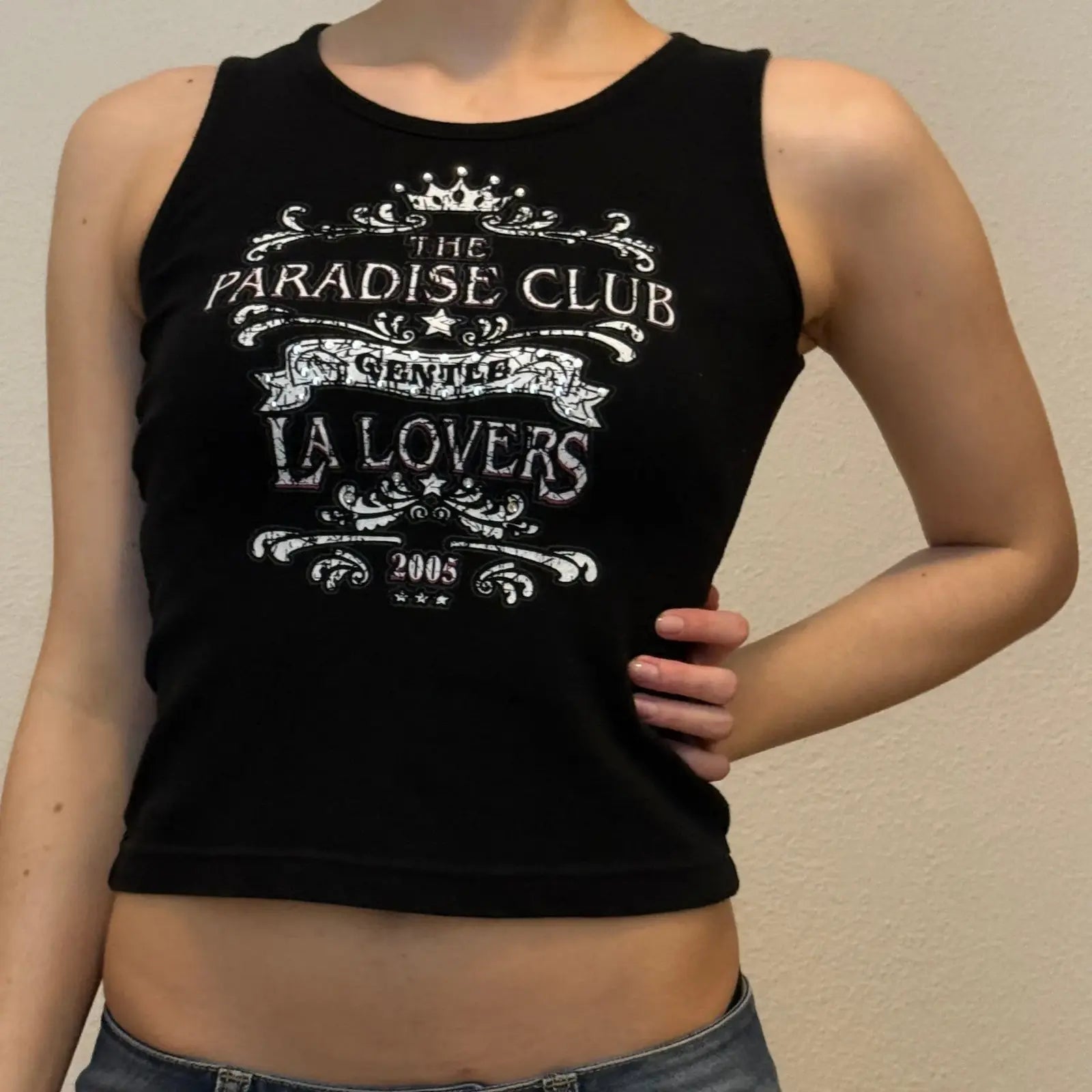 DESCRIPTION: True Y2K black sleeveless tank featuring bold “Paradise Club LA Lovers 2005” graphic with crown and ornate lettering. Fitted and slightly cropped cut, perfect for pairing with low-rise jeans or a mini skirt for that early 2000s club look. A rare graphic piece that channels pure vintage nightlife energy.