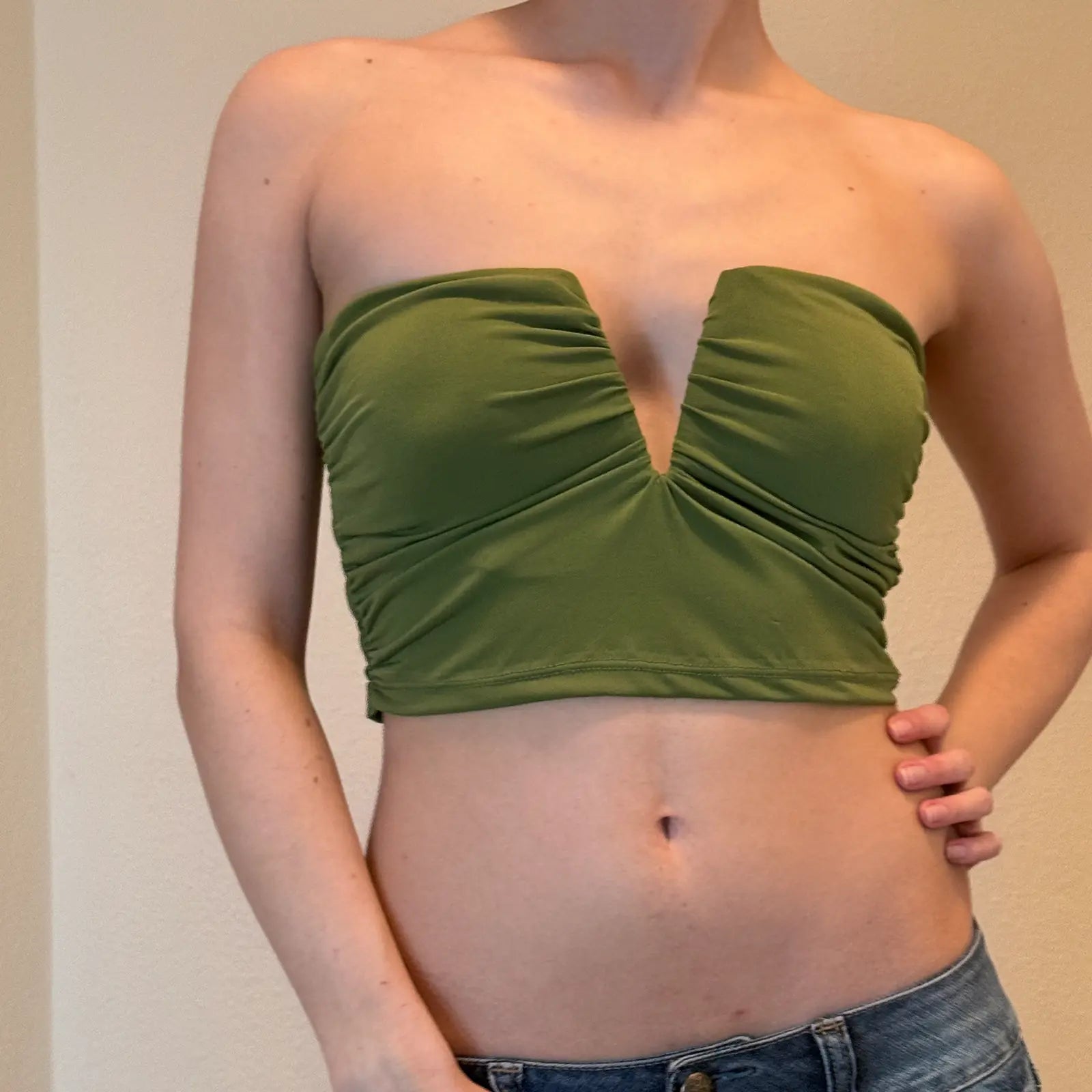 DESCRIPTION: Vintage Y2K olive green strapless crop top with a plunging V neckline and ruched sides. Super stretchy and flattering, perfect for clubwear, festival fits, or 2000s inspired outfits.