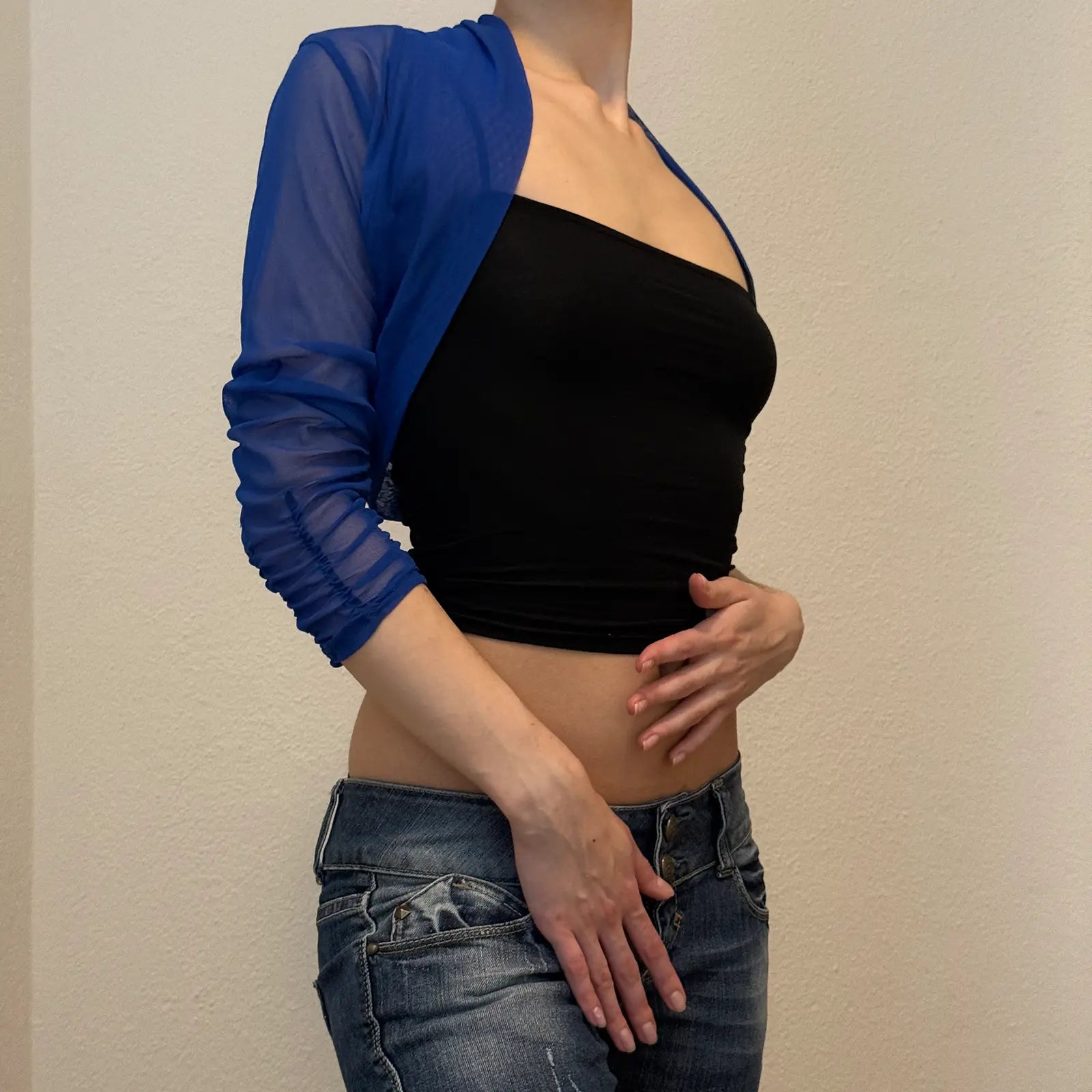 DESCRIPTION: Vintage Y2K bolero shrug in vibrant cobalt blue mesh. Features lightweight sheer fabric with long ruched sleeves and an open front, perfect for layering over camis, dresses, or tube tops. Only the blue sheer shrug is included in this listing.